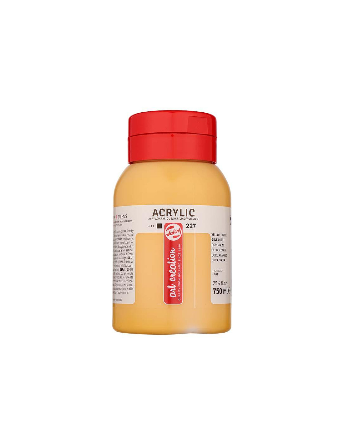 ACRILICO TALENS ART CREATION BOTE 750 ML OCRE AMARILLO 227   Un acrílico de calidad fiable a base del 100% de resina de acrilato. La pintura es pastosa, cuando está seca tiene un brillo sedoso y se puede sobrepintar casi de inmediato. Ocre Amarillo (227) es un color opaco con una excelente resistencia a la luz (+++)