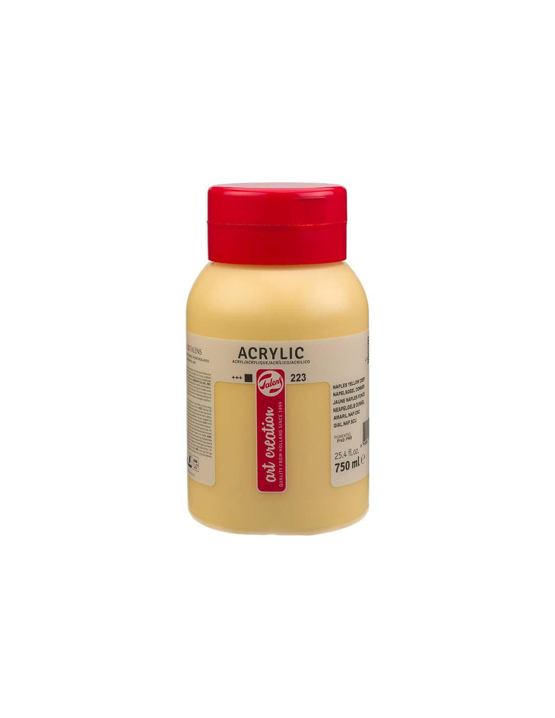 ACRILICO TALENS ART CREATION BOTE 750 ML AMARILLO NAPOLES OSCURO 223  Un acrílico de calidad fiable a base del 100% de resina de acrilato. La pintura es pastosa, cuando está seca tiene un brillo sedoso y se puede sobrepintar casi de inmediato. Amarillo Nápoles Oscuro (223) es un color opaco con una excelente resistencia a la luz (+++).