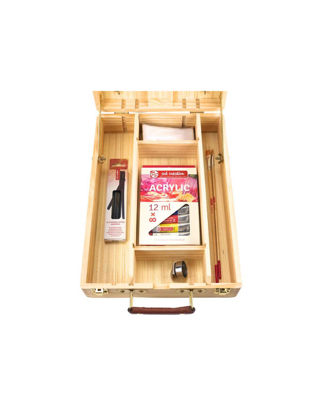 SET PINTURA TALENS ARTEMISA ACRÍLICOS Con Talens Art Creation puedes plasmas fácilmente tu creatividad. El acrílico es una pintura multiuso que se mezcla y diluye sencillamente con agua. Como la pintura se seca rápidamente, puedes aplicar tantas veces como quieras una capa sobre la otra. Se puede usar sobre diversas superficies como lienzo, madera y papel. Este Set incluye: • 8 x 12 ml tubos de acrílico • Caja-caballete de madera de pino • Tabla de lona 33x24 • Paleta desechable • 2 x pinceles (Filament) • Carboncillos • Tela de algodón • Pocillo de metal • Manual PASO A PASO