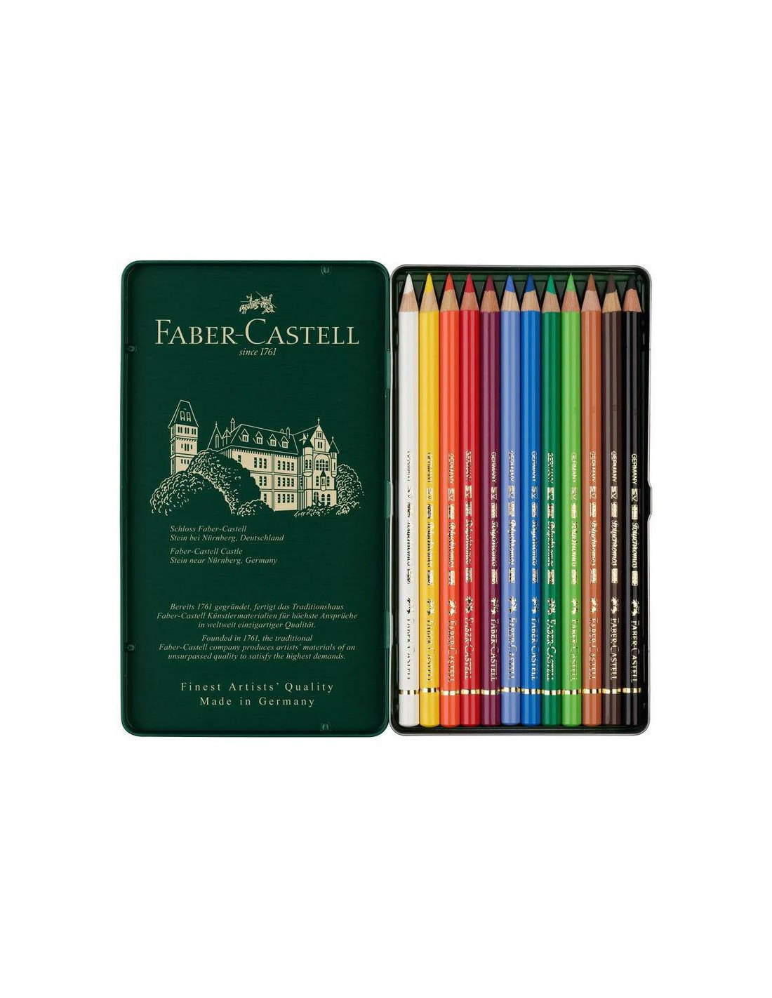 LAPIZ FABER CASTELL POLYCHROMO CAJA METALICA 12 COLORES MOD.110012 Los ecolápices Polychromos son internacionalmente valorados por artistas profesionales y aficionados por su extraordinaria calidad. Sus pigmentos brillan por igual utilizados en composiciones libres o creativas interpretaciones de la realidad. •Pigmentos de alta calidad con resistencia a la acción de la luz y luminosidad de color insuperables •Trazo suave de colorido intenso •Resistente al agua y permanente •Mina de 3,8 mm de grosor •Gran resistencia a la rotura gracias a un encolado elástico entre mina y madera •Estuche de metal con 12 piezas