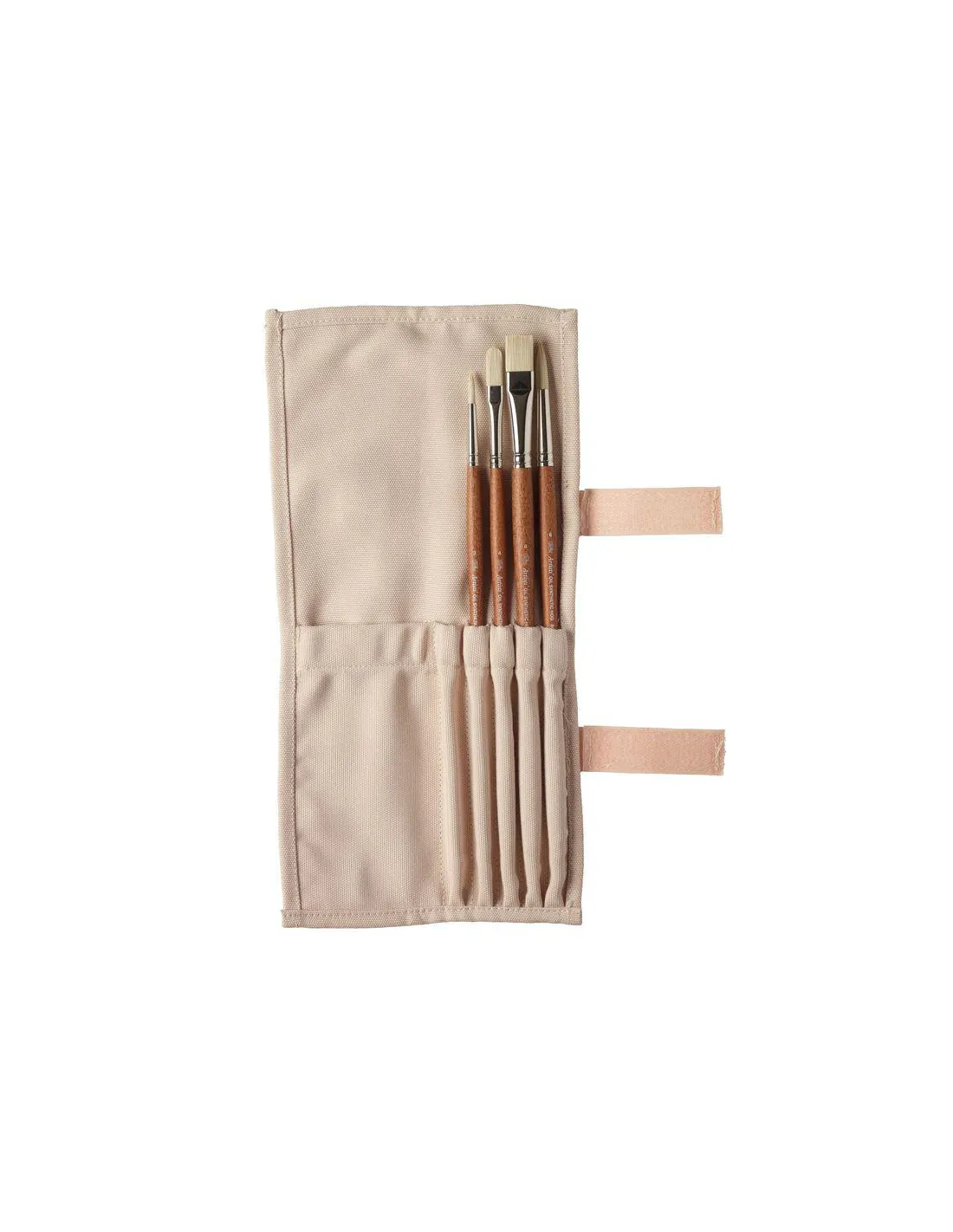 Este set incluye 4 pinceles sintéticos al óleo para artistas en una práctica funda de lona para guardarlos y llevarlos consigo, diseñados para acompañar al artista en su camino creativo. La funda cuenta con cierre de velcro y 7 bolsillos interiores. Seis bolsillos son ideales para pinceles de mango largo (máximo 330 mm de longitud) y un bolsillo más ancho permite guardar utensilios de pintura adicionales.