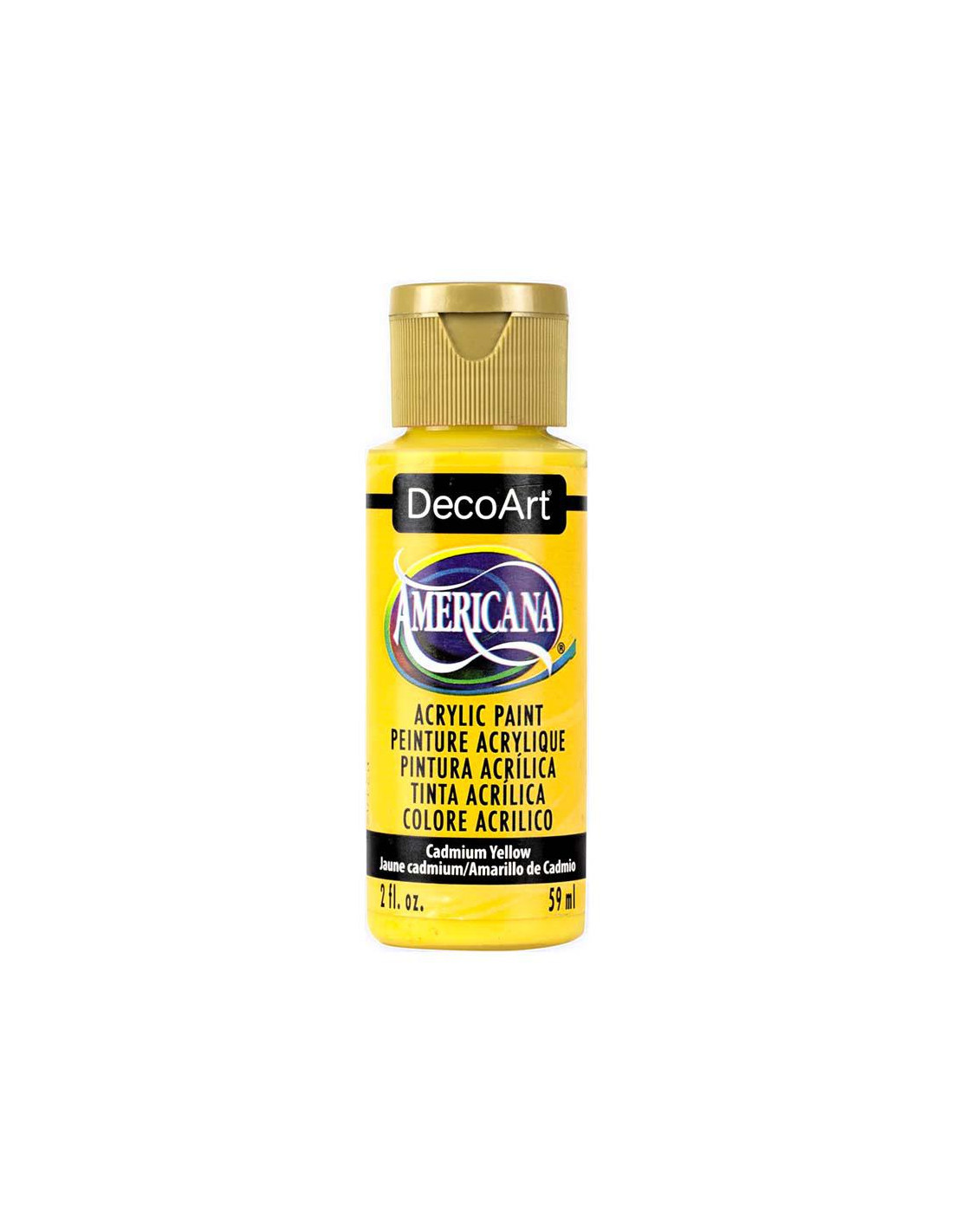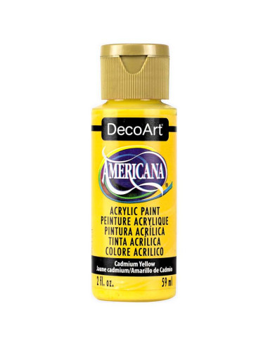 PINTURA ACRILICA AMERICANA 59ml AMARILLO CADMIO Nº 10 Pintura acrílica a base de agua. Superficies aprobadas probadas por artistas: madera, paredes, lona, ??terracota, papel, espuma de poliestireno, cerámica sin esmaltar, metal y piedra. No aprobado para exteriores. Acabado: Mate. Cuerpo (Viscocidad): Medio. Opacidad: varía según el color. No se puede hornear para un acabado apto para lavavajillas. Tiempo promedio de secado al tacto: 20-30 minutos *puede variar con la temperatura, la humedad, etc. Tiempo de secado para curar por completo: 5-7 días *puede variar con la temperatura, la humedad, etc.