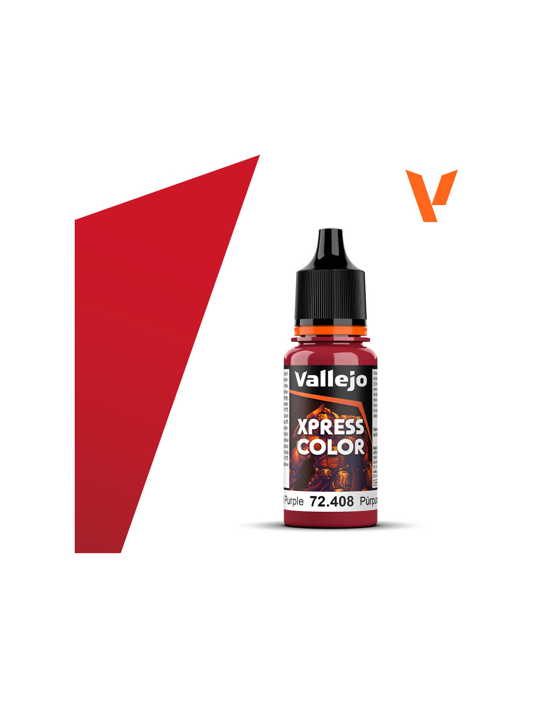 PINTURA VALLEJO GAME COLOR XPRESS 18 ml PÚRPURA CARDENAL Se recomienda aplicar Xpress Color sobre una superficie imprimada o pintada en blanco o gris, donde el color generará zonas de luz sobre los relieves, tonos medios saturados y sombras intensas en las hendiduras de la figura. Los colores de la gama Xpress Color, al igual que el resto de nuestros productos, son muy versátiles y pueden aplicarse sobre cualquier color para crear sutiles efectos de sombreado y perfilado, veladuras o filtros y fundir transiciones entre tonos. Xpress Color se puede mezclar entre sí, o diluir con Xpress Thinner Medium, para modificar o crear nuevas tonalidades. • Modo de empleo: Si bien ofrecen los mejores resultados aplicados a pincel, también pueden aplicarse directamente con un aerógrafo.