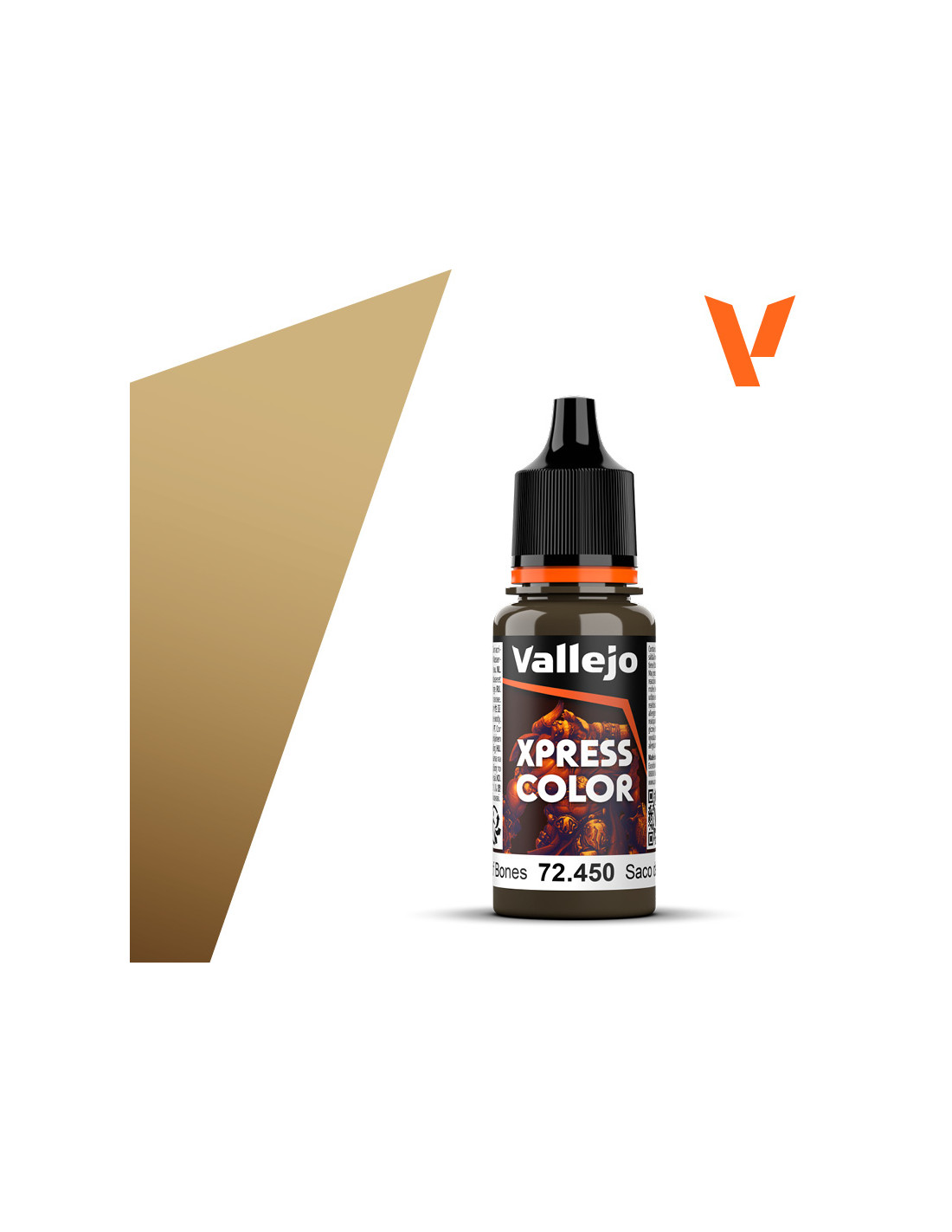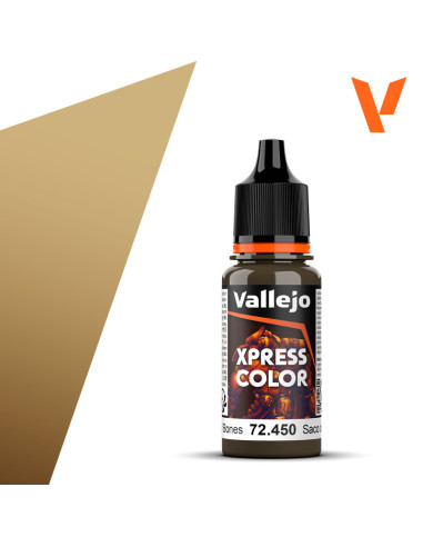 PINTURA VALLEJO GAME COLOR XPRESS 18 ml SACO DE HUESOS Se recomienda aplicar Xpress Color sobre una superficie imprimada o pintada en blanco o gris, donde el color generará zonas de luz sobre los relieves, tonos medios saturados y sombras intensas en las hendiduras de la figura. Los colores de la gama Xpress Color, al igual que el resto de nuestros productos, son muy versátiles y pueden aplicarse sobre cualquier color para crear sutiles efectos de sombreado y perfilado, veladuras o filtros y fundir transiciones entre tonos. Xpress Color se puede mezclar entre sí, o diluir con Xpress Thinner Medium, para modificar o crear nuevas tonalidades. • Modo de empleo: Si bien ofrecen los mejores resultados aplicados a pincel, también pueden aplicarse directamente con un aerógrafo.