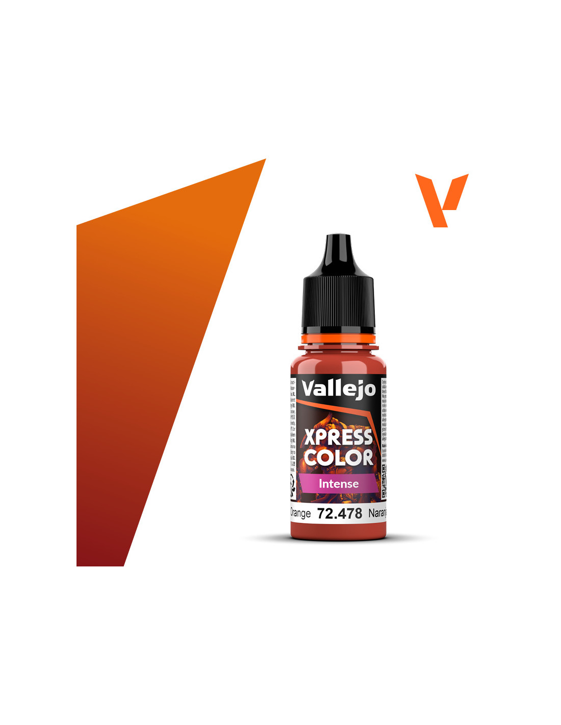PINTURA VALLEJO GAME COLOR XPRESS INTENSE 18 ml NARANJA FENIX Se recomienda aplicar Xpress Color sobre una superficie imprimada o pintada en blanco o gris, donde el color generará zonas de luz sobre los relieves, tonos medios saturados y sombras intensas en las hendiduras de la figura. Los colores de la gama Xpress Color, al igual que el resto de nuestros productos, son muy versátiles y pueden aplicarse sobre cualquier color para crear sutiles efectos de sombreado y perfilado, veladuras o filtros y fundir transiciones entre tonos. Xpress Color se puede mezclar entre sí, o diluir con Xpress Thinner Medium, para modificar o crear nuevas tonalidades. Xpress Color Intense incorpora mayor carga de pigmento para obtener tonos más vibrantes y saturados. • Modo de empleo: Si bien ofrecen los mejores resultados aplicados a pincel, también pueden aplicarse directamente con un aerógrafo.