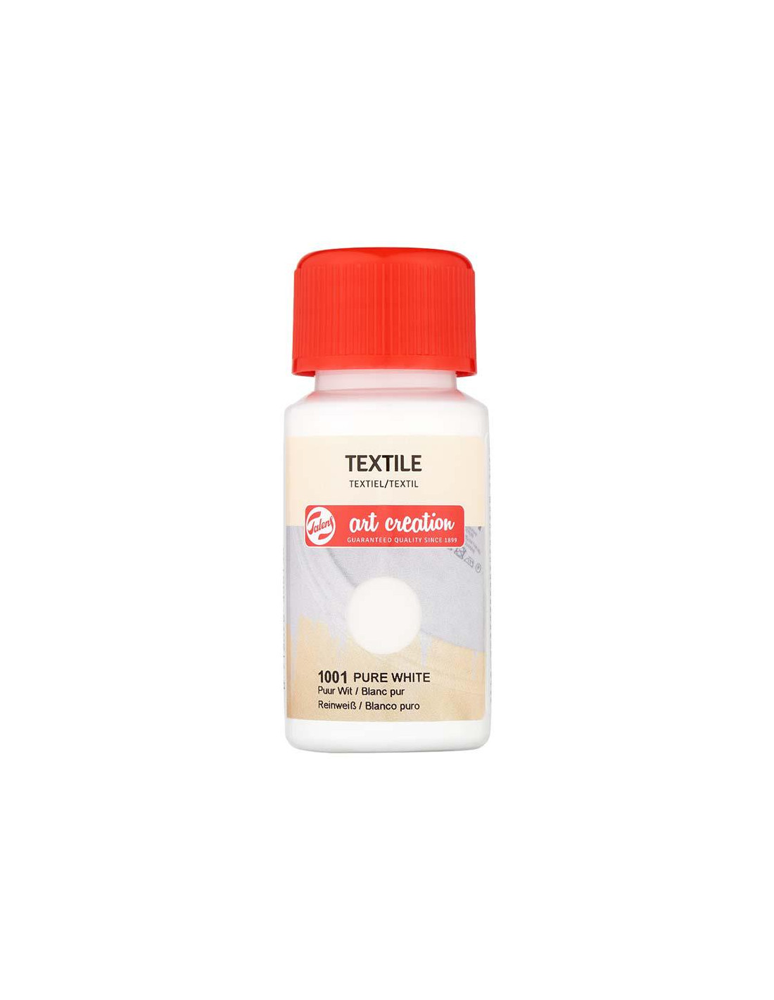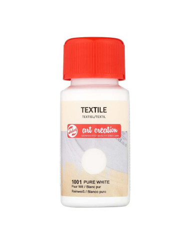 PINTURA TEXTIL ART CREATION BOTE 50ML BLANCO PURO 1001 Recicla ropa, accesorios o decoraciones de interior como fundas de almohadas, cortinas y otros artículos textiles con la pintura Textil de Talens Art Creation. Textil es una pintura textil para telas claras (mínimo 50 % algodón. Modo de uso •Para obtener los mejores resultados, prelava el artículo de tela sin suavizante y deja que se seque por completo. •Aplica la pintura al tejido con una esponja o un pincel suave y deja que se seque durante 30 minutos. •Fija la pintura usando una plancha (a temperatura para algodón) con papel protector (como papel encerado) entre la tela y la plancha. •Después del ajuste de calor, el artículo se puede lavar hasta 40 °C y es adecuado para la secadora. Deja que el artículo se seque completamente, ¡y disfruta de tu nuevo diseño personalizado!