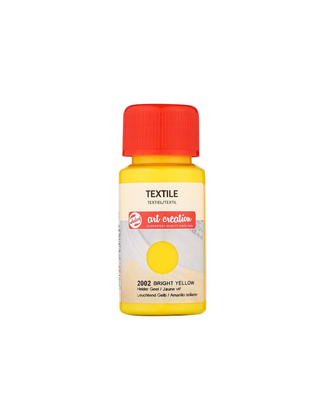 PINTURA TEXTIL ART CREATION BOTE 50ML AMARILLO BRILLANTE 2002 Recicla ropa, accesorios o decoraciones de interior como fundas de almohadas, cortinas y otros artículos textiles con la pintura Textil de Talens Art Creation. Textil es una pintura textil para telas claras (mínimo 50 % algodón. Modo de uso •Para obtener los mejores resultados, prelava el artículo de tela sin suavizante y deja que se seque por completo. •Aplica la pintura al tejido con una esponja o un pincel suave y deja que se seque durante 30 minutos. •Fija la pintura usando una plancha (a temperatura para algodón) con papel protector (como papel encerado) entre la tela y la plancha. •Después del ajuste de calor, el artículo se puede lavar hasta 40 °C y es adecuado para la secadora. Deja que el artículo se seque completamente, ¡y disfruta de tu nuevo diseño personalizado!